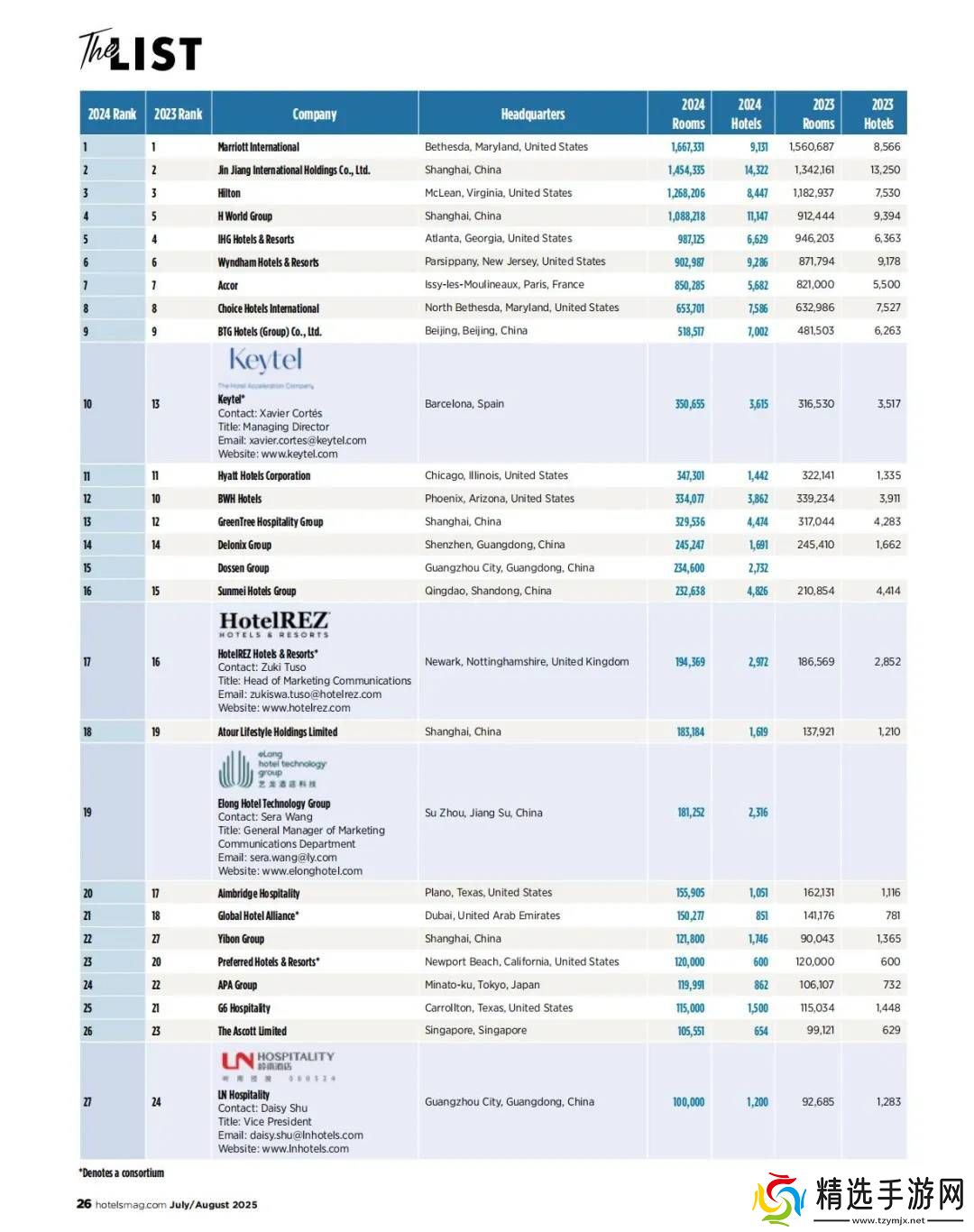 万豪国际集团再次荣登全球酒店业榜首,根据《HOTELS》杂志最新发布的“2024年度全球酒店集团205强”榜单,该集团凭借166.7万间客房的数量稳居第一,远超锦江国际集团、希尔顿集团以及华住集团。