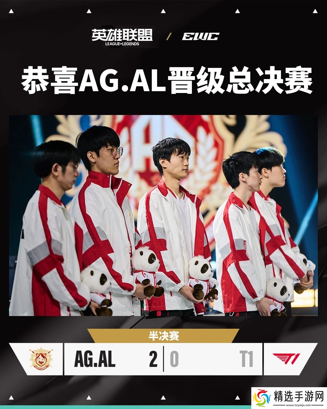 本站 7 月 19 日消息,北京时间今天傍晚,AG.AL 在半决赛中以 2:0 的成绩战胜 T1,进军 EWC 电竞世界杯《英雄联盟》项目总决赛。