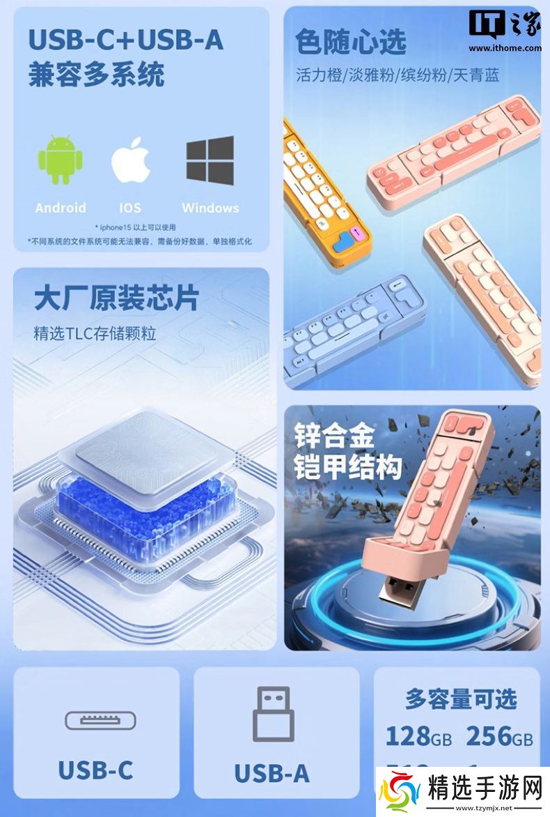 据介绍,系列 U 盘可选活力橙、缤纷粉、天青蓝配色,U 盘壳体采用锌合金结构,提供 USB-C / A 双口可选,虽然官方将系列 U 盘标注为“传输速度 550MB/s”和“传输速度 1050MB/s”两种版本,但实际上两种版本中的不同存储规格实际读速有所区别,本站附相应 U 盘参数如下: