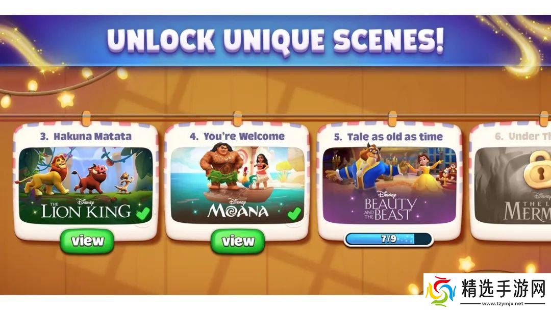 游戏在外围系统设计上也充分利用了IP的吸引力,玩家通过通关可以解锁不同的主题和收集经典故事场景,为纸牌接龙游戏增添了故事感。通过IP赋能和更加完善的流程体验,《Disney Solitaire》成功提升了纸牌接龙品类的品质标准,吸引了更多泛用户群体。