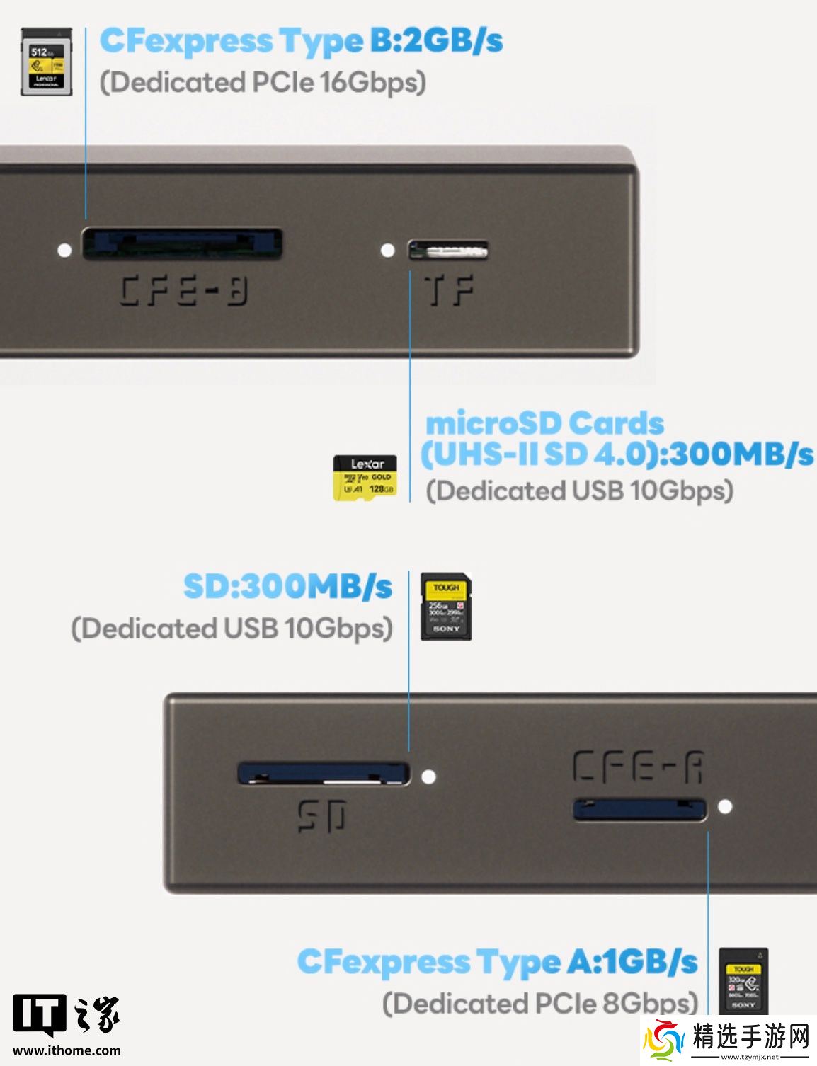 据介绍,该读卡器支持同时读取 CFexpress Type A、CFexpress Type B、SD(UHS-II)以及 TF 卡(microSD)四种存储卡,所有卡槽均采用独立通道设计,在同时插入多张卡片的情况下也能保持满速传输。其中 Type B 卡槽读速 2GB/s,Type A 卡槽读速 1GB/s,SD / microSD 卡槽读速 300MB/s,整机最大总传输速率可达 2790MB/s。