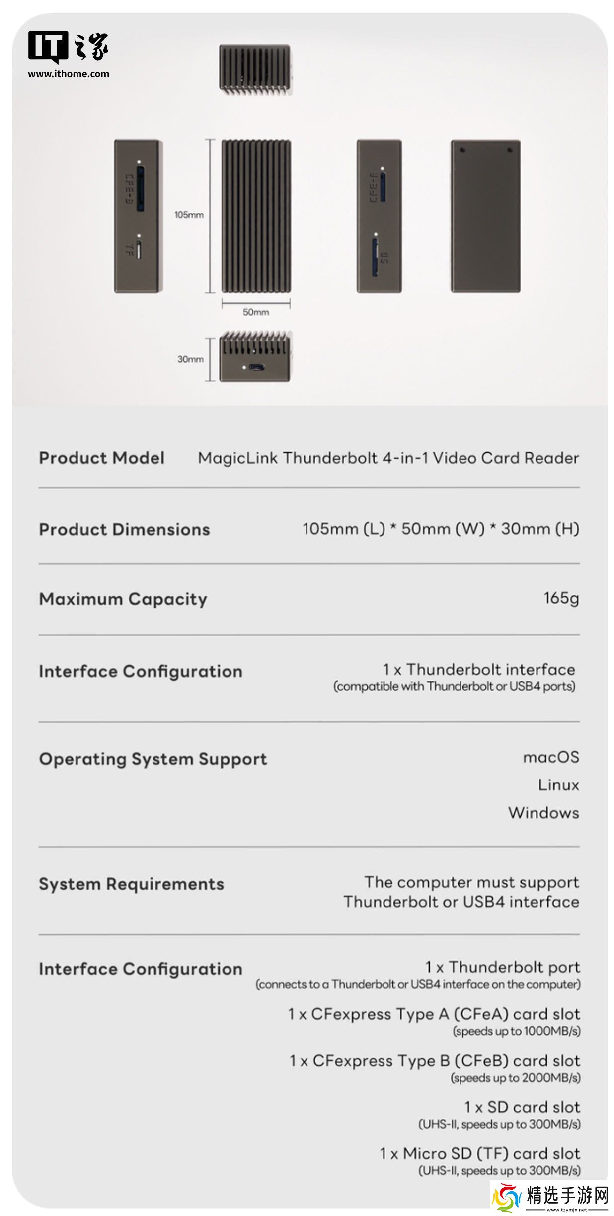 本站 7 月 19 日消息,制造商 MagicLink 现推出一款“MagicLink 4 合 1 读卡器”,主打“全球最快多卡同时读取”,最大数据传输速率可达 2790MB/s,定价 119 美元(本站注:现汇率约合 854.8 元人民币)。