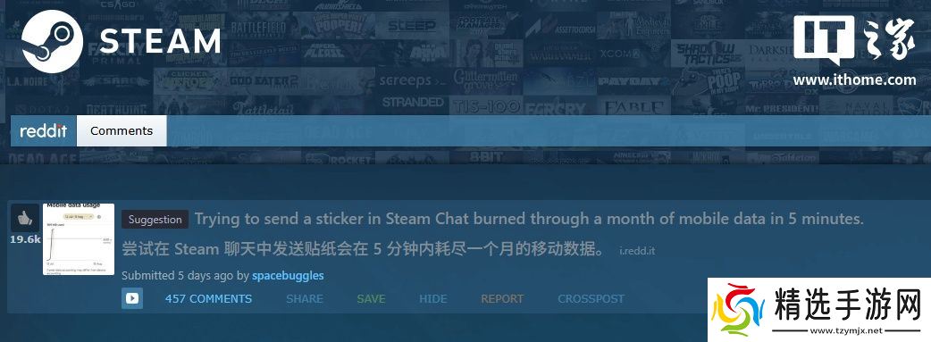 本站 7 月 20 日消息,有些应用程序的数据消耗比你想象的要大得多。近日,一位名为 spacebuggles 的 Reddit 用户称,在尝试通过 Steam 聊天发送贴纸时,短短 5 分钟内就耗尽了整个月的移动数据流量。