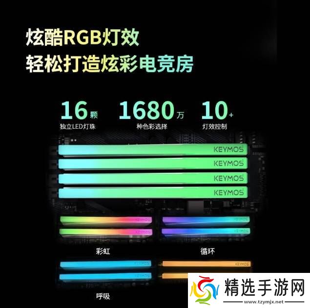 在灯效设计上,KEYMOS科摩思赤霄白帝DDR5内存同样不遗余力。它配备了16颗独立LED灯珠,支持1680万种色彩选择和10多种灯效控制模式。玩家可以根据自己的喜好自定义内存灯效,如彩虹模式、循环模式、呼吸模式等,从而打造出个性化的电竞氛围。