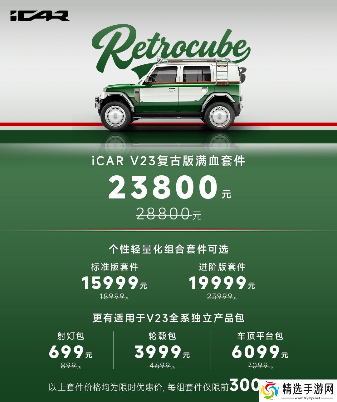 本站 7 月 21 日消息,奇瑞今晚推出了 iCAR V23 车型的复古套件,满血套件售价 28800 元,前 300 套立减 5000 元后 23800 元。这些套件采用电镀、实木等材质,凸显金属质感。