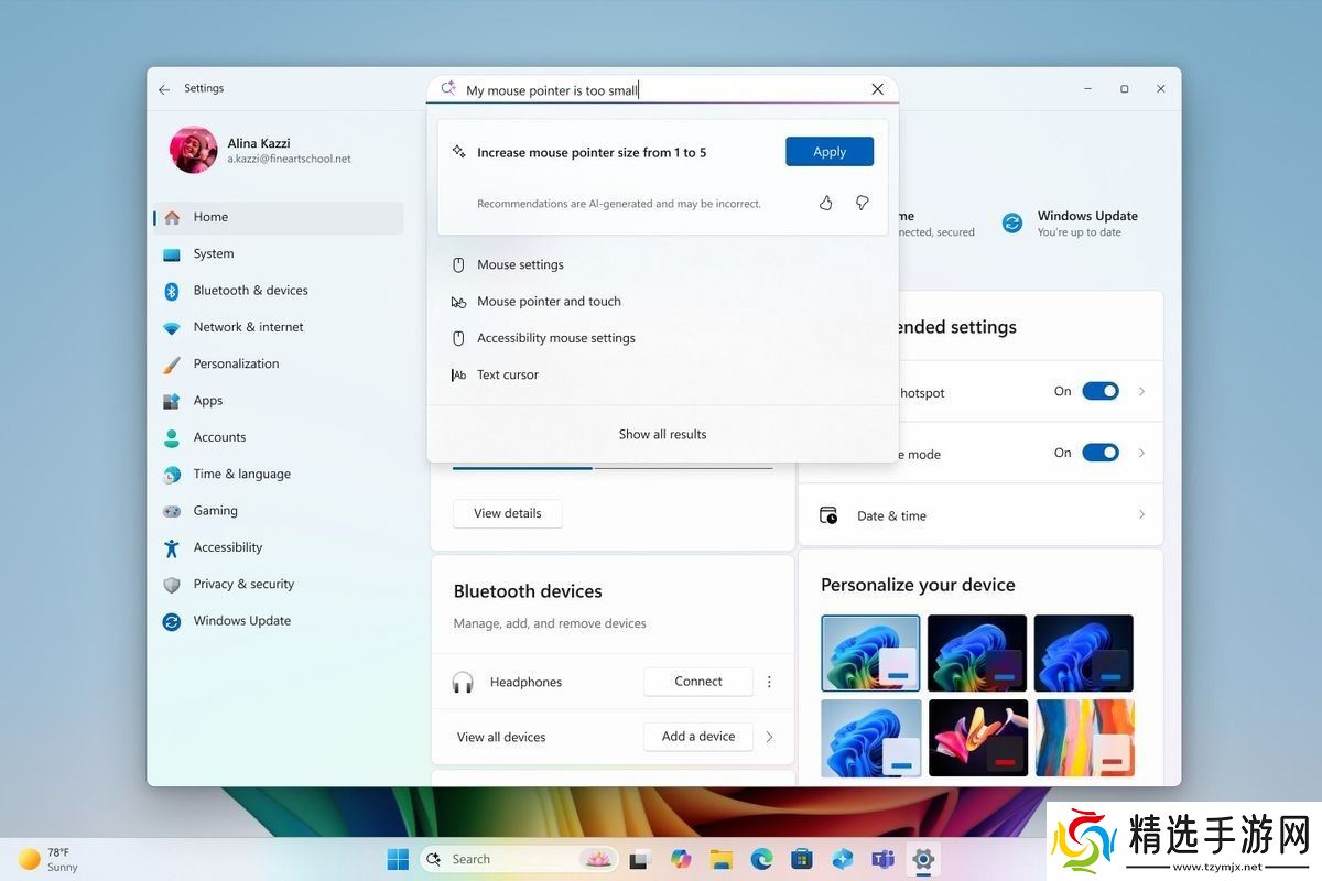 [新增功能] 在 Windows 11 AI+ PC 设备上,设置应用中引入新的智能体,帮助用户寻找和更改相关设置。用户可以描述需要帮助的内容,例如“如何通过语音控制我的电脑”或“我的鼠标指针太小”,智能体将会建议解决问题的步骤。