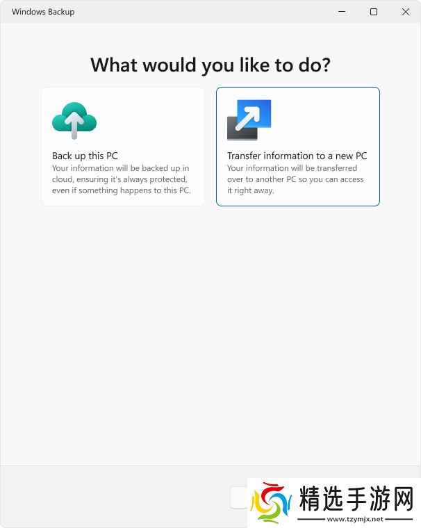 在 Windows 备份应用中,选择“将信息传输到新电脑”以开始配对。