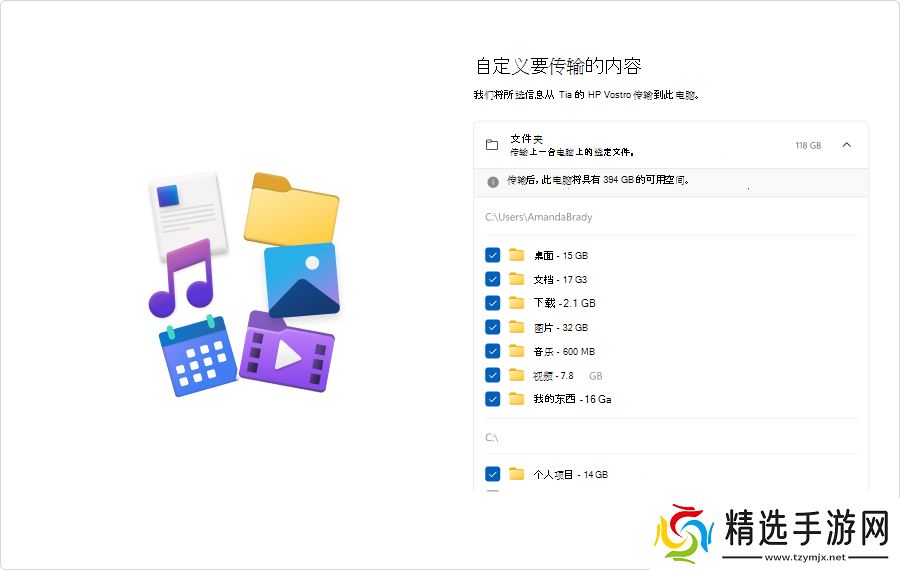 所有文件:跨文件夹或驱动器保存的文档、照片、视频和其他文件将传输到新电脑。