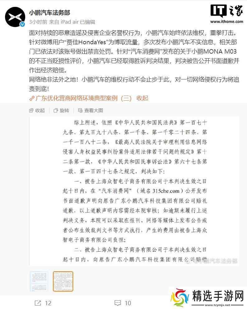 针对“汽车消费网”发布的关于小鹏 MONA M03 的不正当贬损性评价,小鹏汽车已经取得胜诉判决结果,判决被告公开书面道歉并作出经济赔偿。