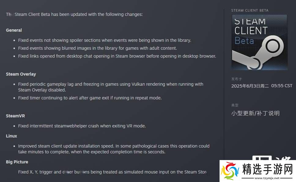 在官方发布的更新日志中,详细列举了此次更新的多项改进与修复。首先,通用修复部分解决了库内活动页面无法显示剧透保护内容的问题,同时修复了NSFW内容游戏在库内活动页面图像模糊显示的问题。还解决了桌面聊天链接优先在Steam浏览器而非默认浏览器打开的问题,并修复了禁用Steam覆盖层时,使用Vulkan渲染的游戏可能出现的周期性卡顿和冻结现象。对于重复计时器模式,也修复了退出游戏后仍持续提示的问题。