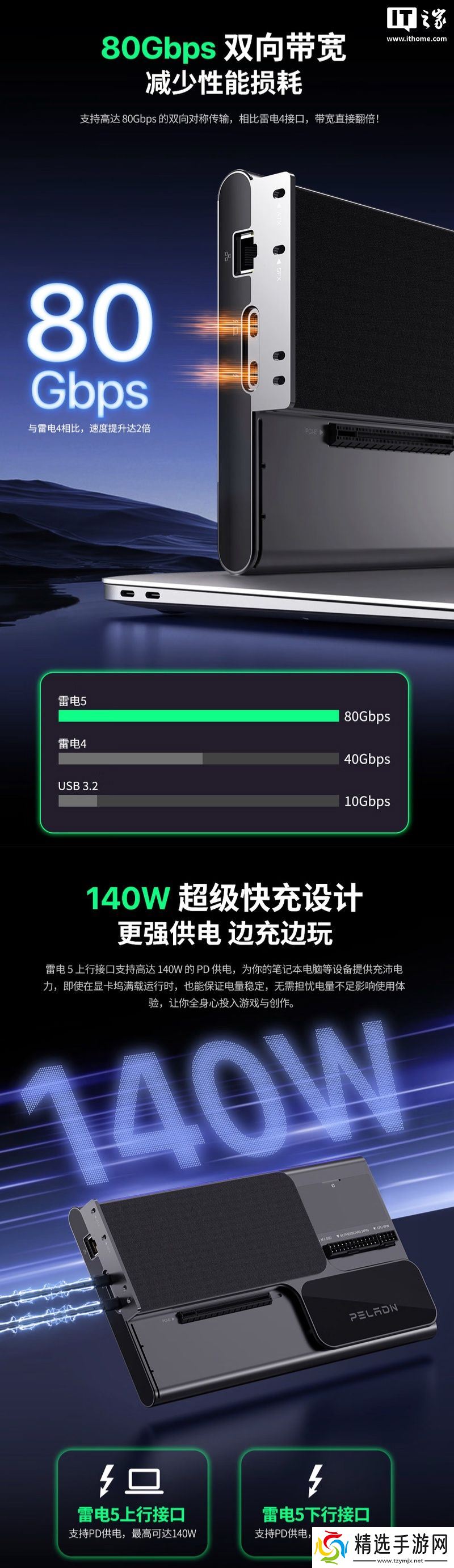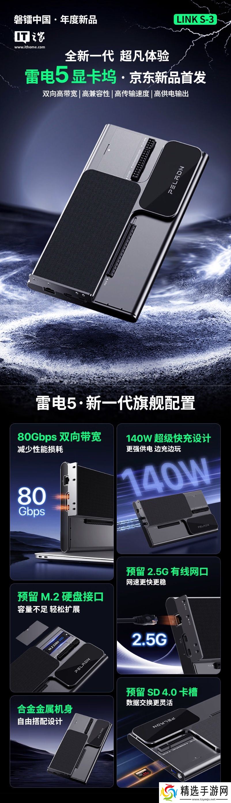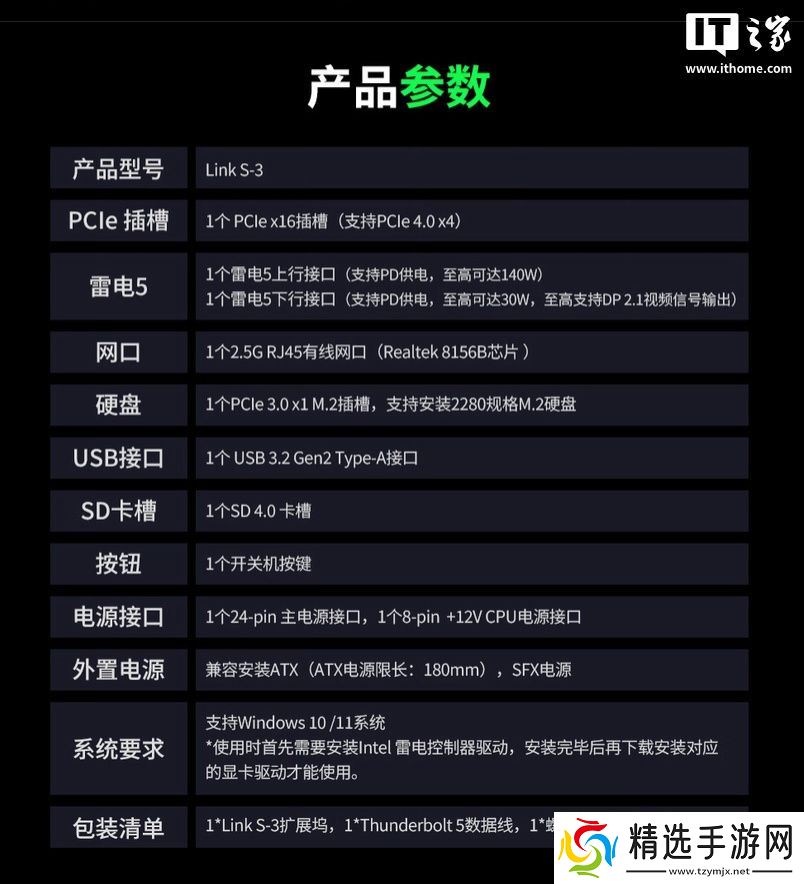 据介绍,磐镭 Link S-3 是一款外接台式机显卡、**电源形式的显卡坞,本体仅提供扩展功能。其拥有一对 80Gbps 雷电 5,其中上行接口支持 140W PD-out、下行支持 30W PD-out 和 DP 2.1 视频信号输出。
