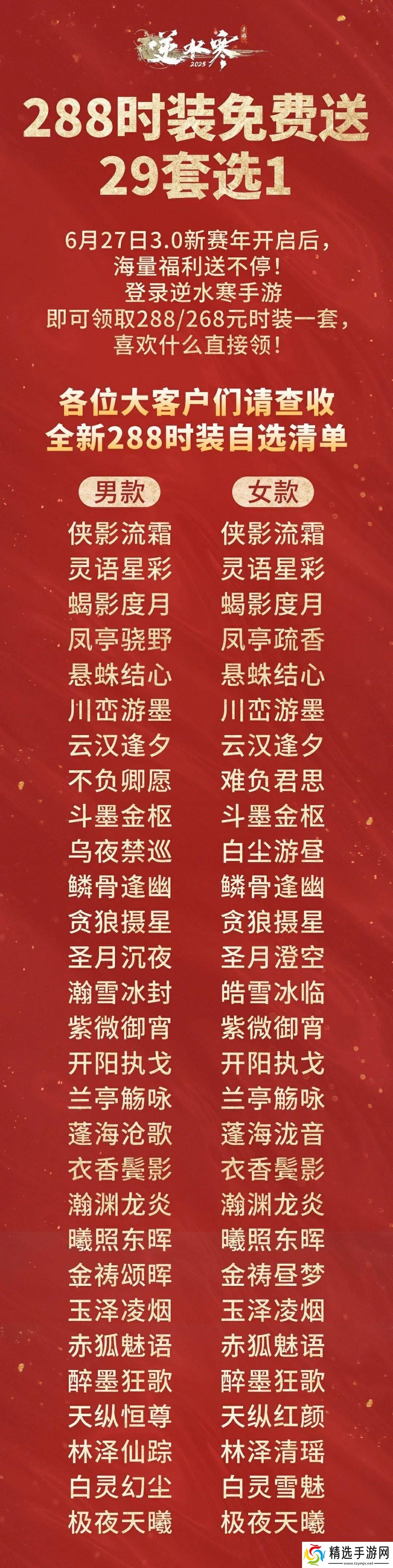 在6月27日资料片上线当天,所有登录游戏的玩家都将直接获得一套288时装自选礼包,共有29款精美时装供玩家选择,满足不同玩家的个性化需求。