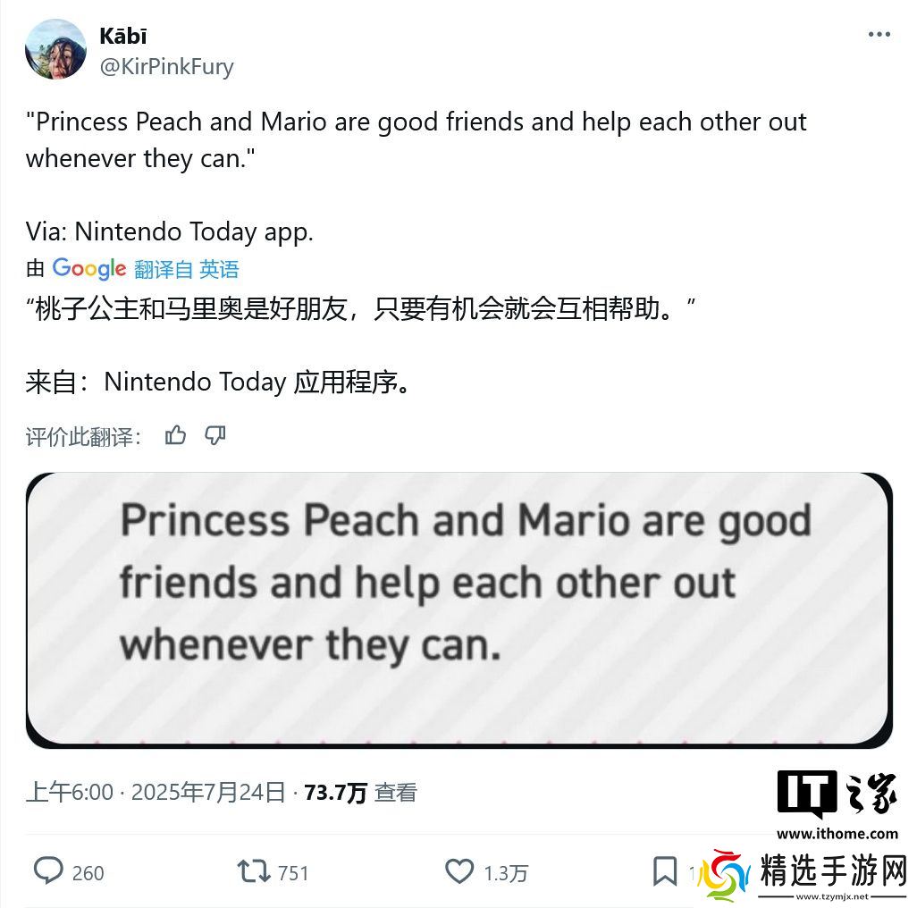 本站 7 月 26 日消息,游戏媒体 IGN 昨日(7 月 25 日)发布博文,报道称任天堂在其官方 Nintendo Today 应用中,称马力欧(Mario)和碧姬公主(Princess Peach)只是好朋友,并非多数玩家此前认为的情侣关系。
