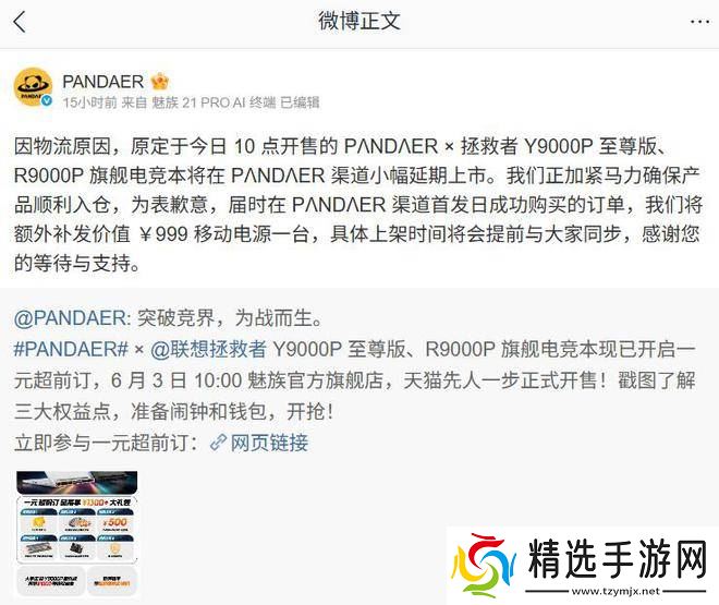 近日,魅族PANDAER官方通过其微博平台发布了一则关于产品上市延期的通知。据悉,原计划在6月3日上午10点正式发售的PΛNDΛER与拯救者合作的Y9000P至尊版及R9000P旗舰电竞本,由于物流方面的原因,将不得不在PΛNDΛER渠道推迟上市。