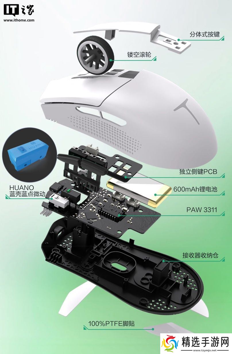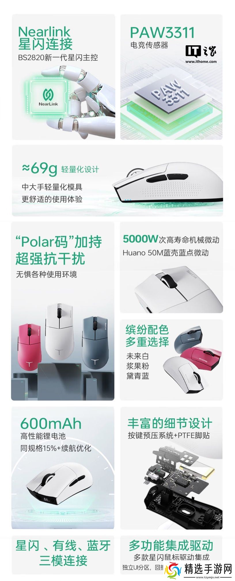 规格方面,该鼠标采用星闪 BS2820 主控,提供双 1KHz 回报率,匹配 PAW3311 传感器,支持 12000DPI,提供 5000 万次寿命环诺 50M 蓝壳蓝点微动,匹配 600 毫安时电池。