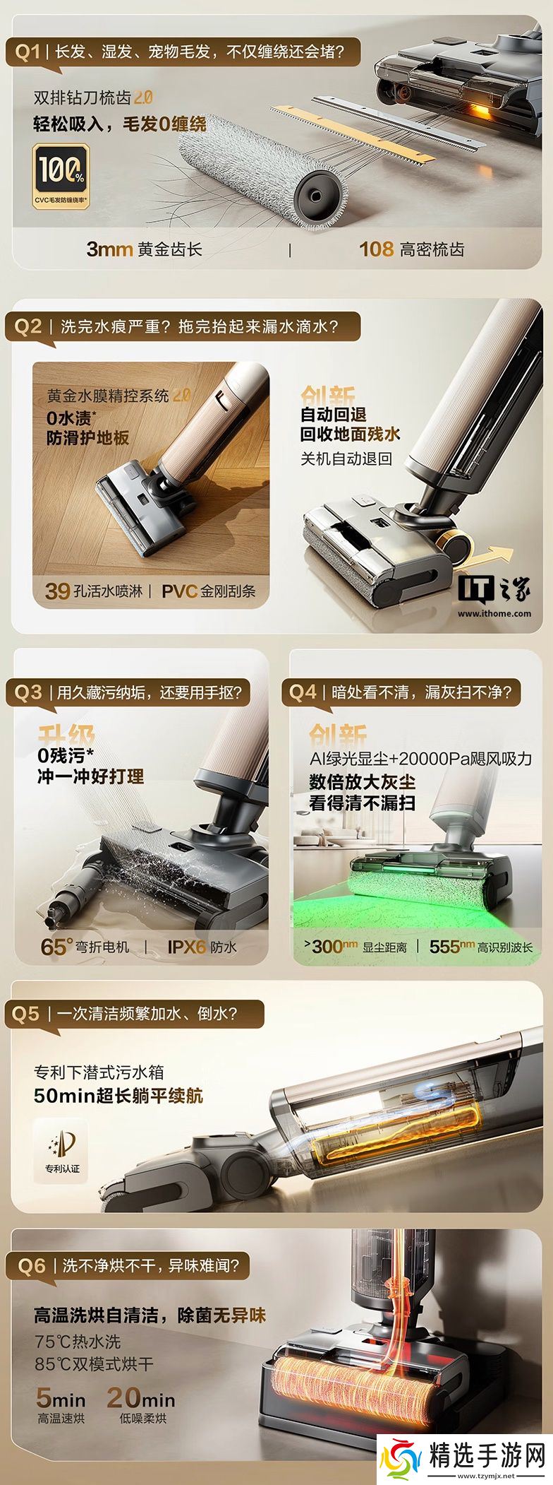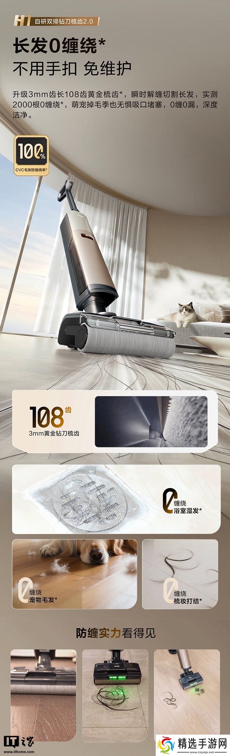 据介绍,这款洗地机提供 20000Pa 吸力,同时带有双排钻刀梳齿 2.0 系统,可实现 50cm 长发一次性吸入,吸入即粉碎,全程 0 缠绕。