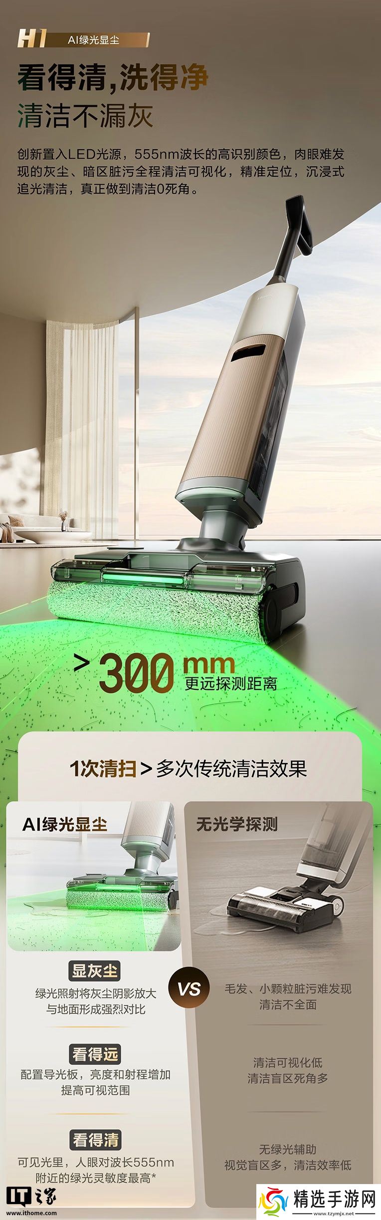 其他方面,该洗地机提供 65° 弯折可水洗电机,拥有 IPX6 防水设计;匹配绿光显尘技术,拥有 >300nm 显尘距离;洗地机内置 800ml 容量水箱,提供 5000mAh 电池,拥有 50 分钟续航。