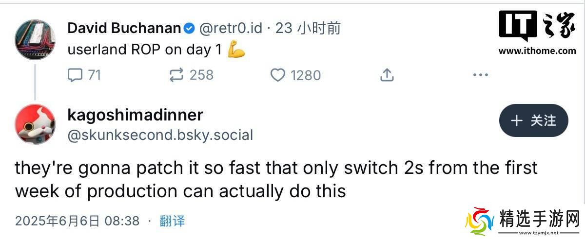 在发布这一消息后,David Buchanan还以玩笑的口吻表示:“这玩意儿其实没啥实际用途,而且我也没法证明我只是在放个YouTube视频。”这一幽默的言论也引发了网友们的热议。有用户评论道:“任天堂肯定会很快修复这个漏洞,估计只有早期生产的Switch 2才能利用这个漏洞。”