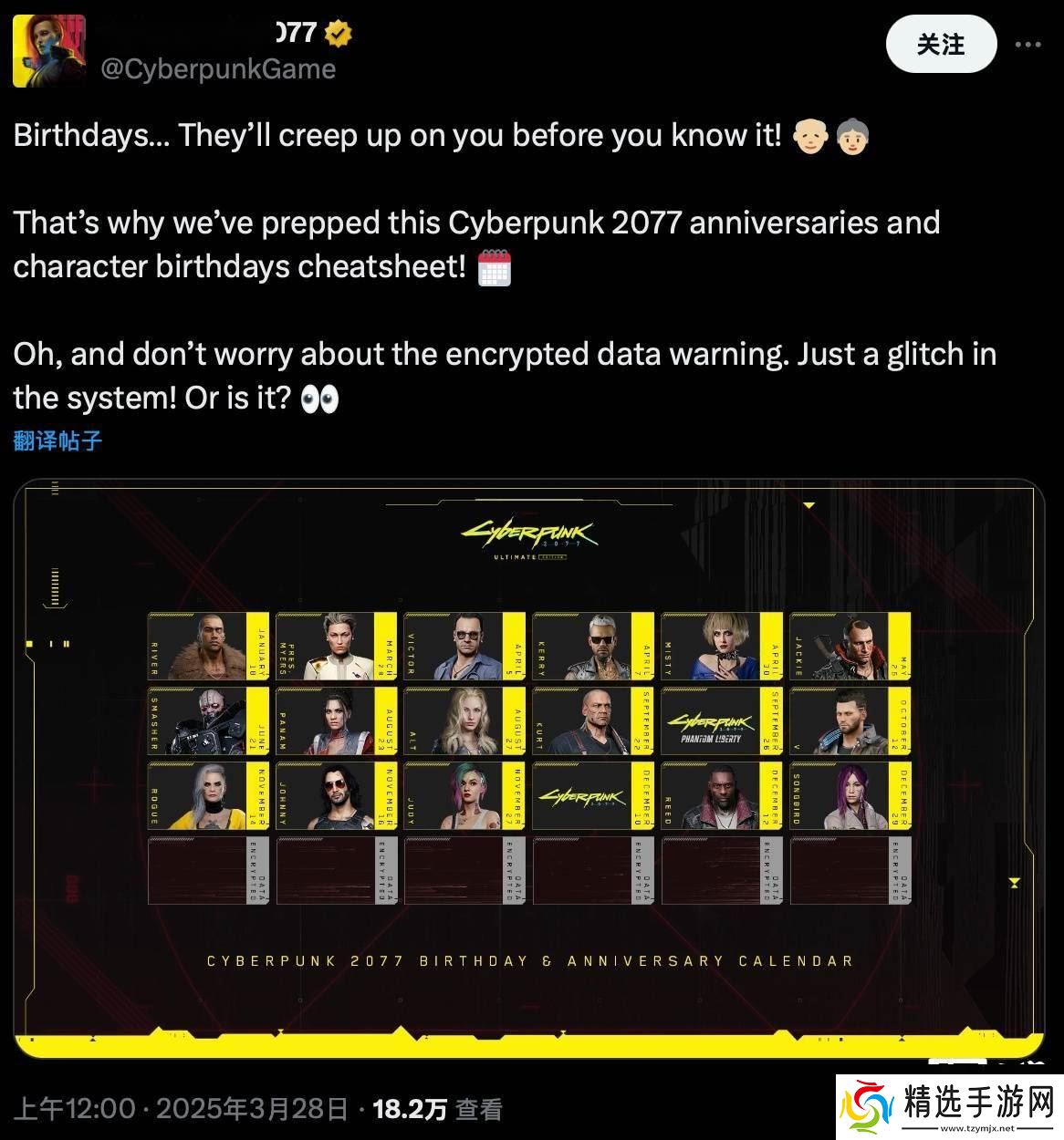 与此同时,玩家们还发现了《赛博朋克 2077》官方账号在社交媒体上留下的神秘线索。今年3月28日,官方X账号发布了一段视频,其中包含了六个被标记为“加密数据”的隐藏角色。视频配文更是引人遐想:“别在意加密数据警告,只是系统故障……或者另有玄机?”这一举动无疑进一步激发了玩家们对游戏新内容的期待。