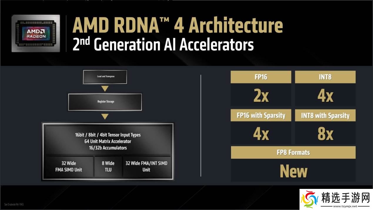 RDNA 4架构是AMD的最新一代图形架构,采用台积电4nm工艺制造,拥有539亿个晶体管,晶体管密度高达150MTr/mm²。该架构在显存子系统管理、AI加速、标量单元指令集、寄存器动态分配等方面进行了显著优化,整体效率和时钟频率得到了大幅提升。RDNA 4还引入了第二代AI加速器,支持16/8/4bit Tensor输入和FP8数据格式,显著提升了机器学习任务的处理效率。
