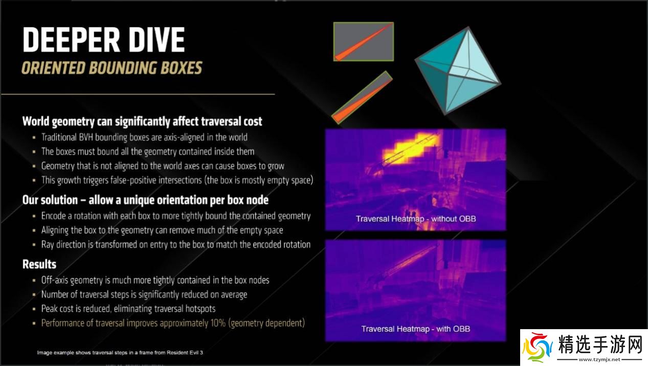 在光线追踪方面,RDNA 4架构也取得了显著进步,光线追踪性能提升了两倍。这得益于新的光线交叉引擎和光线变换引擎,以及定向边界框(OBB)技术的引入,显著降低了BVH的内存需求,并提高了光线遍历性能。RDNA 4还支持宽松的无序内存请求,进一步提升了性能。