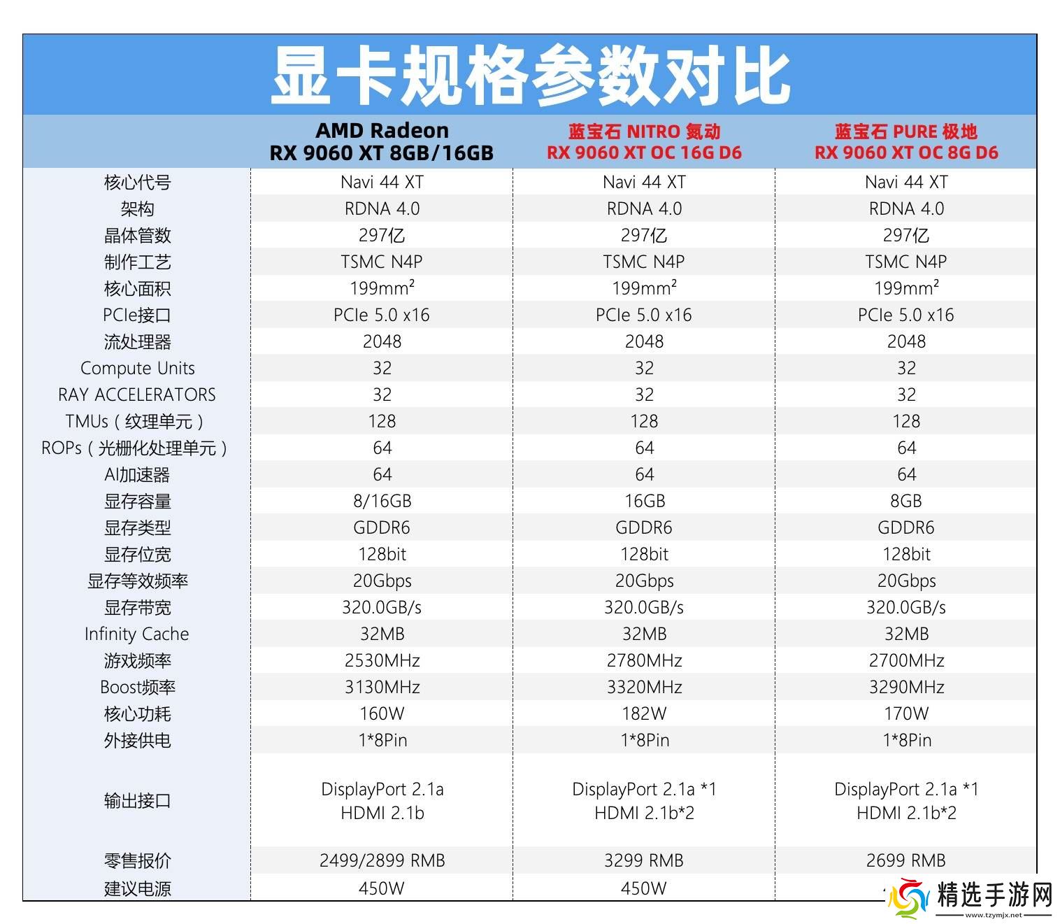 这两款显卡均搭载了Navi 44芯片,基于RDNA 4架构,拥有32个计算单元(CU)和2048个流处理器。蓝宝石NITRO氮动RX 9060 XT OC 16G D6的加速频率高达3320 MHz,功耗设定为182W;而蓝宝石PURE极地RX 9060 XT 8G OC D6的加速频率也达到了3290 MHz,功耗为170W。两者均支持PCIe 5.0×16接口,视频输出包括DisplayPort 2.1a和HDMI 2.1b,显存位宽为128-bit,等效频率为20Gbps,显存带宽达到320 GB/s。