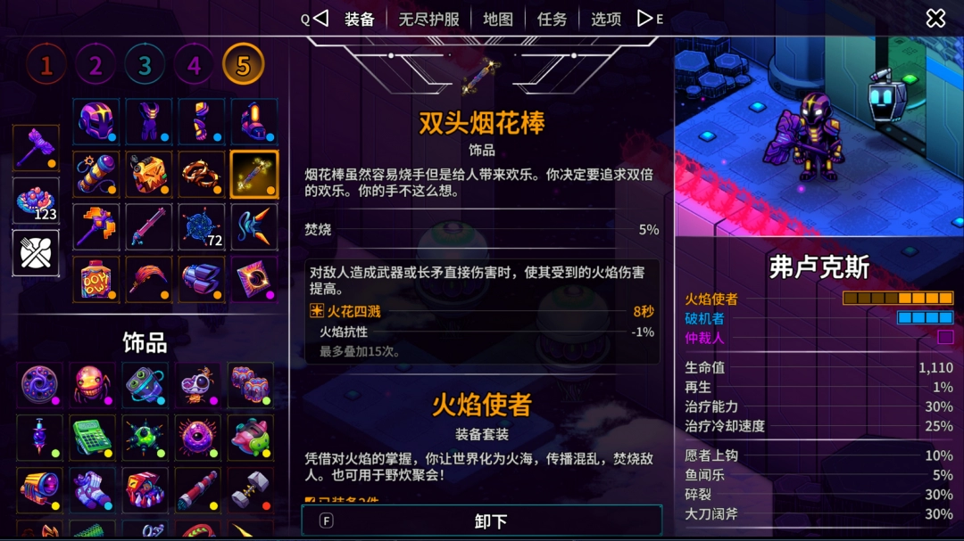 《崩溃大陆2》中的火力全开成就是游戏里比较麻烦的一个成就,成就的要求就是焚烧加成效果超过100%,这个并不算难,首先是锻炉烧火棍+8,然后是单片望远镜+5,之后是纵火犯的汽油罐+5。