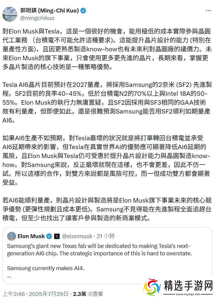 近期,知名分析师郭明錤在社交媒体上发表了对特斯拉即将推出的AI6芯片的看法,引起了业界的广泛关注。他认为,AI6不仅是特斯拉在自动驾驶领域迈出的重要一步,同时也为马斯克及其团队提供了一个以较低成本涉足晶圆代工业务、增强芯片设计能力的契机。