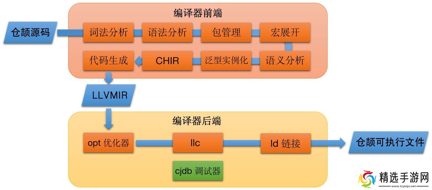 仓颉编译器提供了仓颉编译器源码及 cjdb 调试工具源码,仓颉编译器的整体框架及编译流程如下图展示: