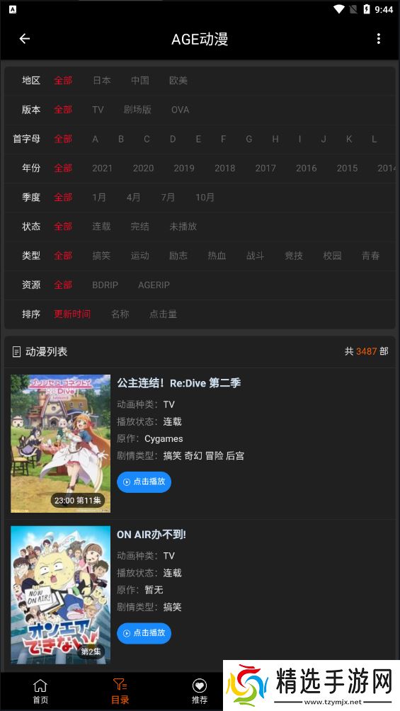 2、目录页面:会对动漫进行地区、版本、首字母、年份、季度等排列,方便用户寻找;