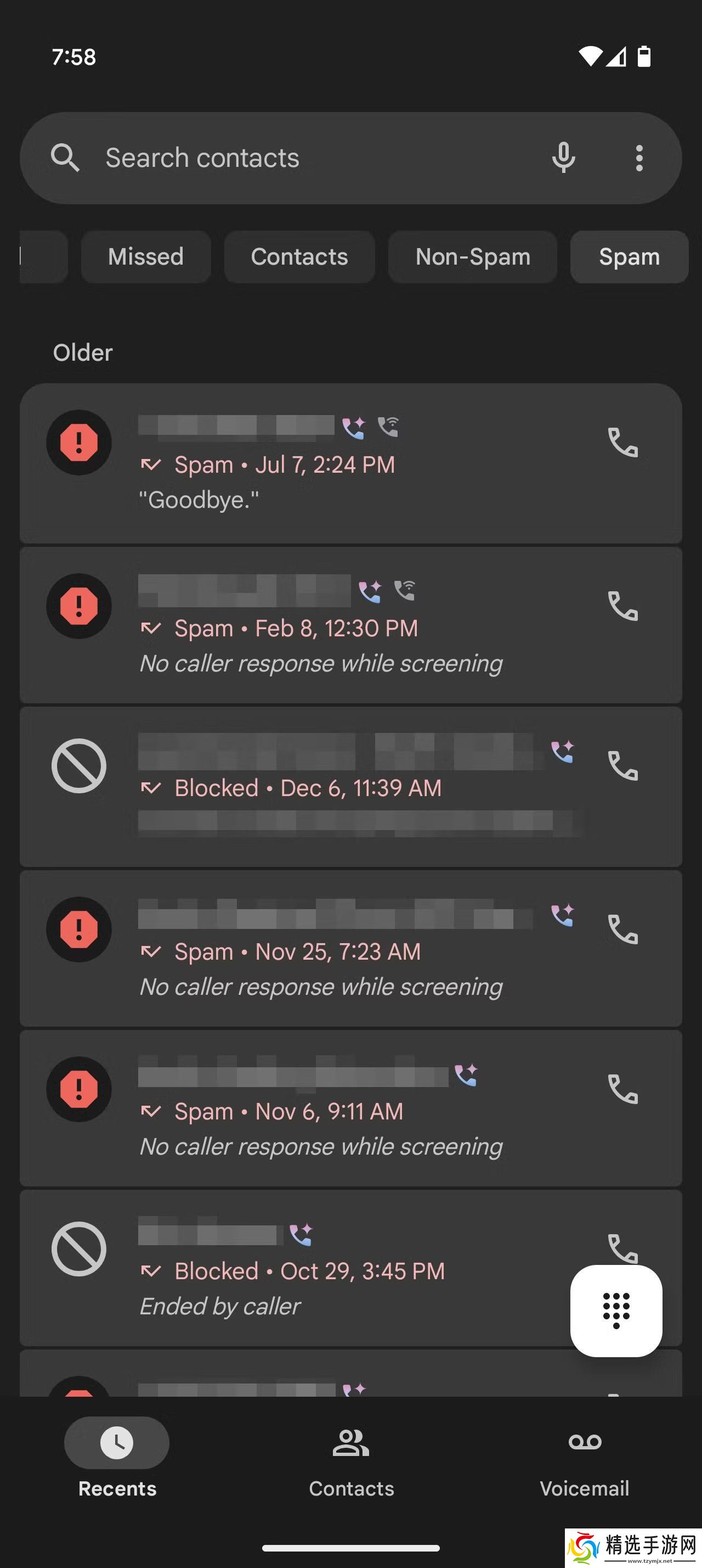 底部菜单栏从四个标签缩减为三个,“收藏”标签被移至“最近通话”页上方的下拉菜单。“最近通话”页还新增筛选功能,支持查看“全部”“未接”“联系人”“非骚扰”“骚扰电话”等不同类型的通话记录。