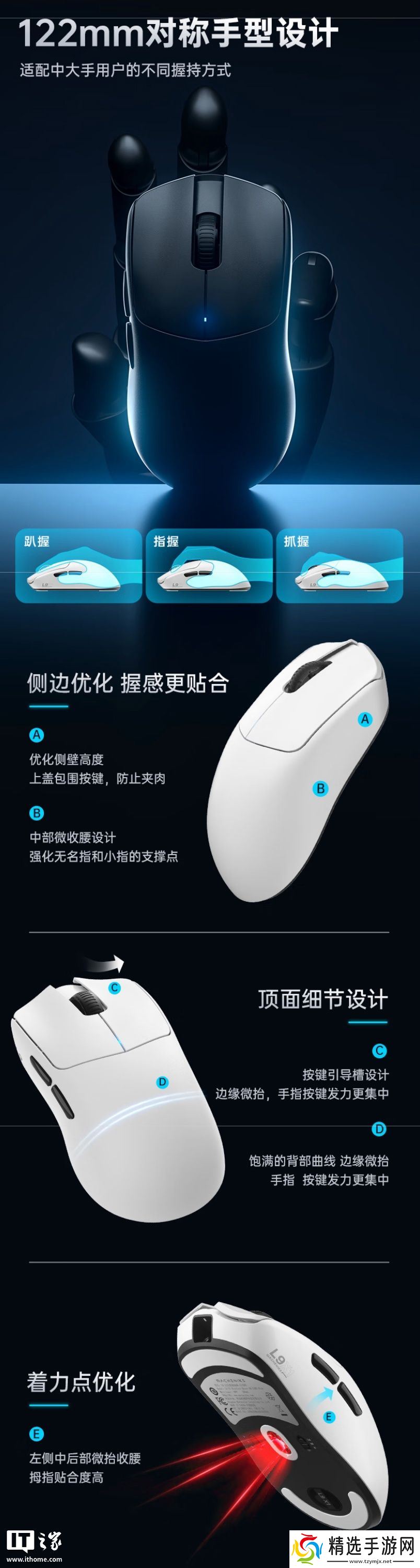系列鼠标带有纳米冰肤涂层,采用 122mm 人体工程学对称手型设计,适用于中大手形。其中双 8KHz 版本的鼠标匹配原相 PAR2862 主控芯片和 PAW3395 传感器(1KHz 版本鼠标提供 PAW3311 传感器),提供 1 亿次寿命凯华白刃微动。
