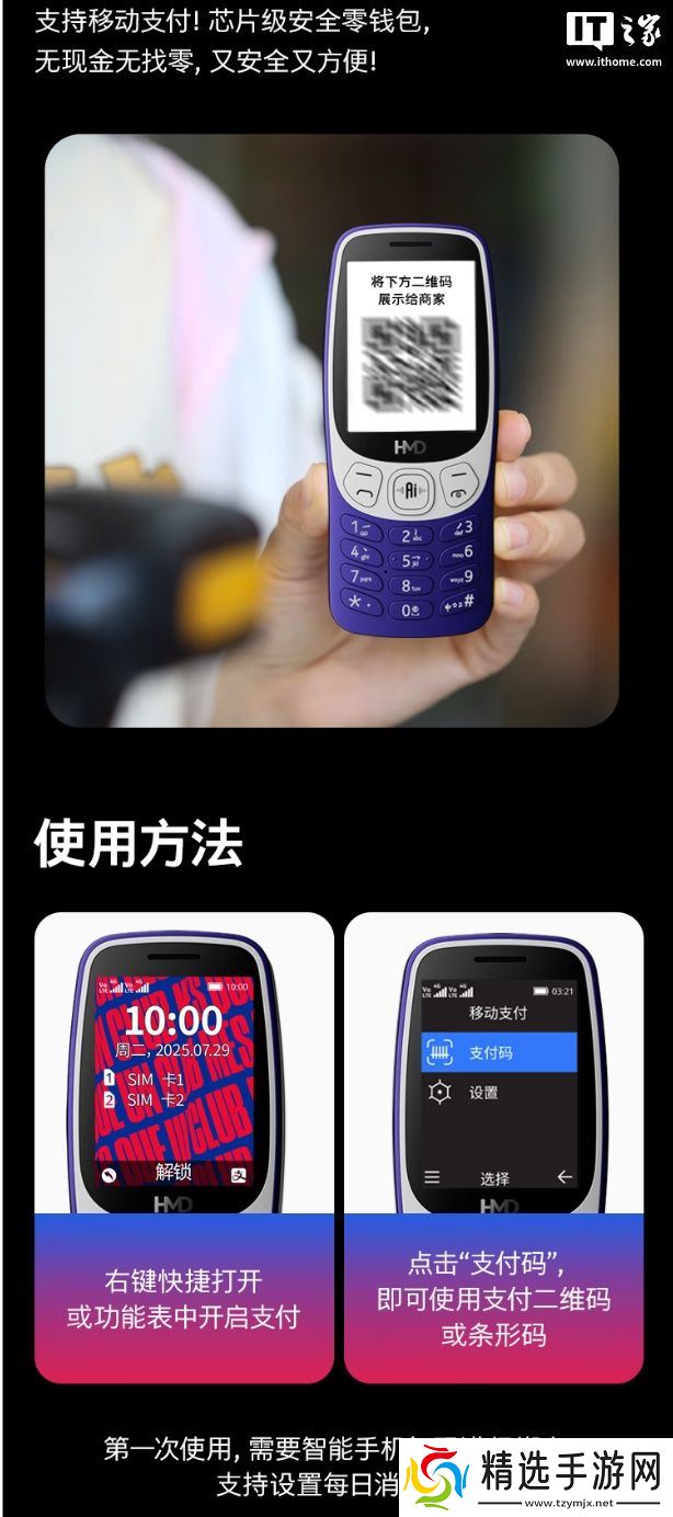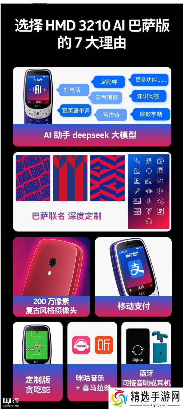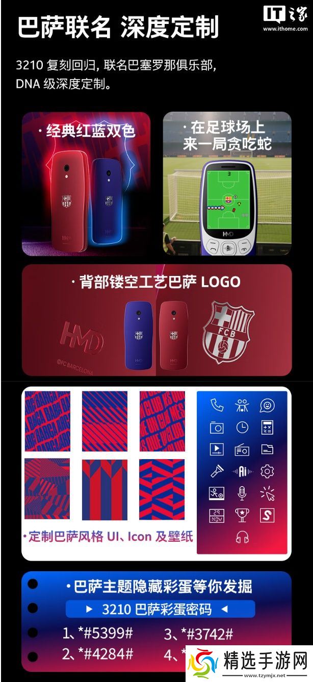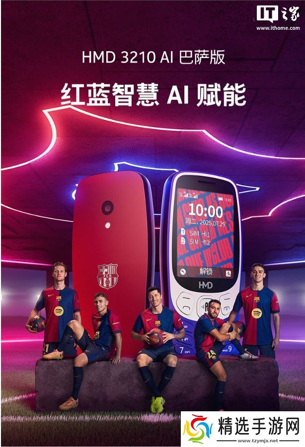 本站 8 月 1 日消息,HMD Global 旗下巴塞罗那足球队联名版 3210 功能手机现已在京东开启首销,这款功能机配备足球队定制外壳、壁纸、系统界面,同时支持支付宝被扫支付、Deepseek AI 助手,首发价 429 元。