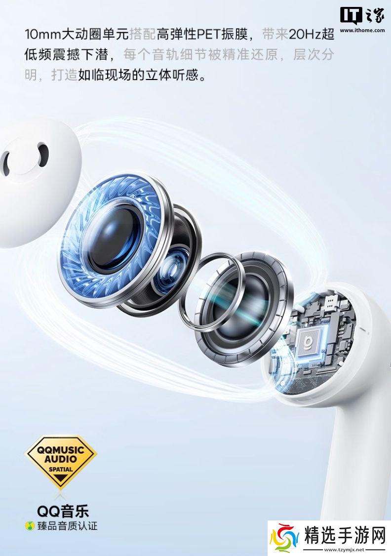 该耳机采用人体工程学设计,单耳重量 4.1 克,提供 10mm 动圈,拥有 20Hz-20KHz 频宽,响应速度 60ms,取得 QQ 音乐音质认证,同时耳机支持四麦克风 AI 通话降噪。