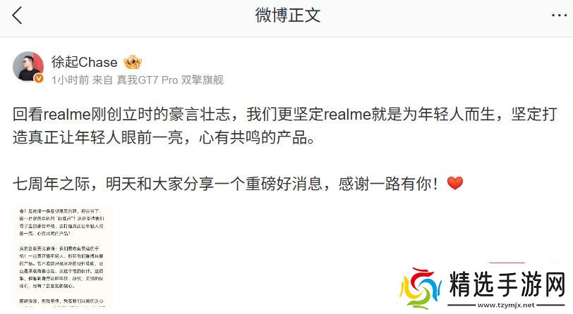 此外他宣布,真我七周年之际,明天将分享一个重磅好消息(具体内容未说明,待明日公布)。