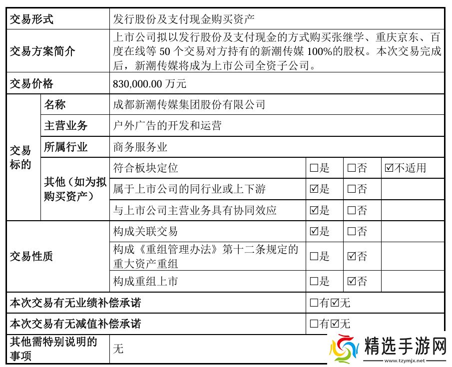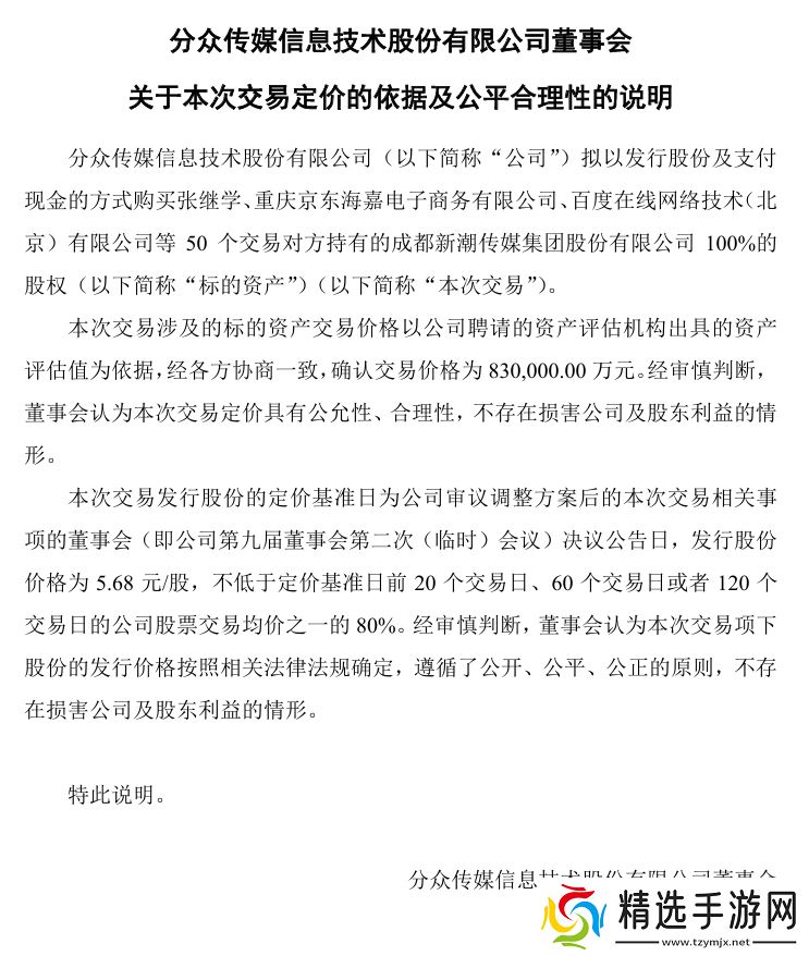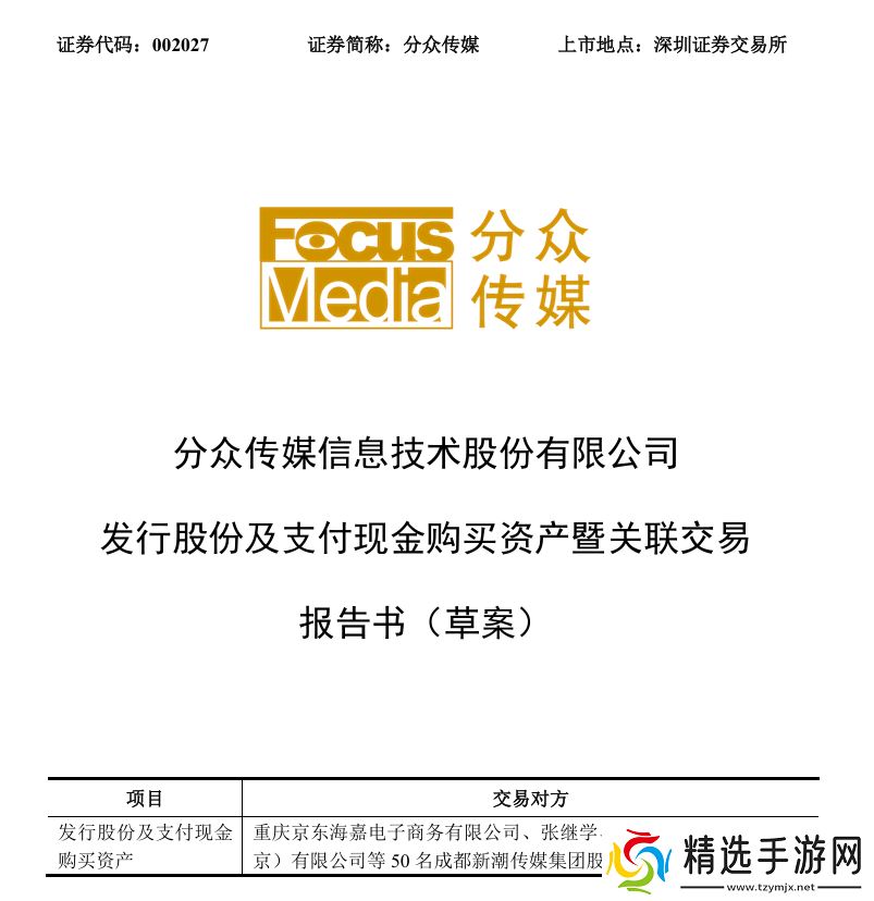 本站 8 月 6 日消息,分众传媒 8 月 6 日公告,公司拟以发行股份及支付现金的方式购买张继学、重庆京东、百度在线等 50 个交易对方持有的新潮传媒 100% 的股权,交易价格为 83 亿元。本次交易完成后,新潮传媒将成为分众传媒的全资子公司。