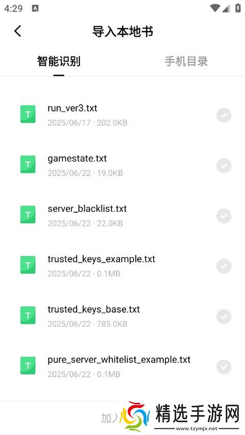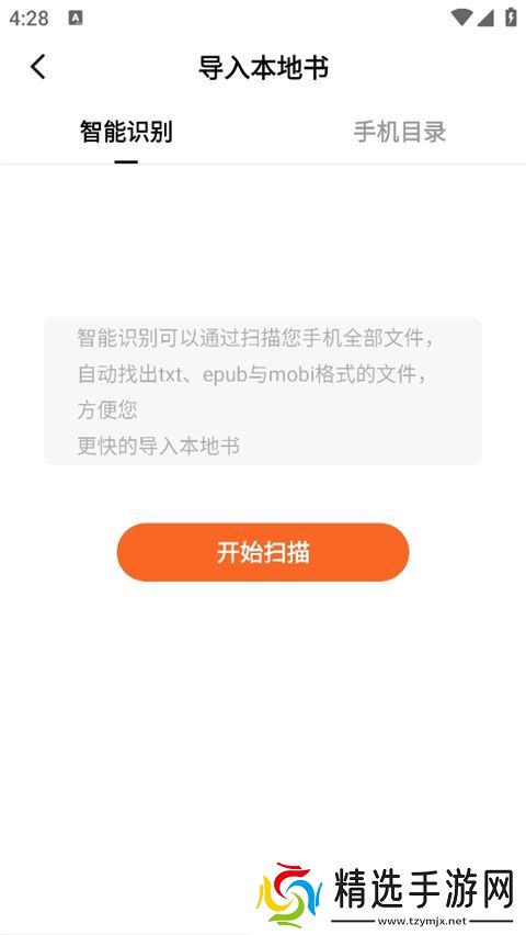 3、点击本机导入后,系统会自动跳转至手机文件夹。若手动寻找小说文件困难,可启用【智能识别】功能扫描TXT格式的本地书籍。