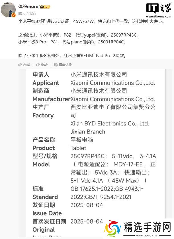 本站 8 月 7 日消息,两款小米平板新品于 8 月 4 日通过了国内 3C 认证,支持 45W / 67W 快充,和上代一致。据博主 @体验more 透露,这两款产品为小米平板 8 系列。