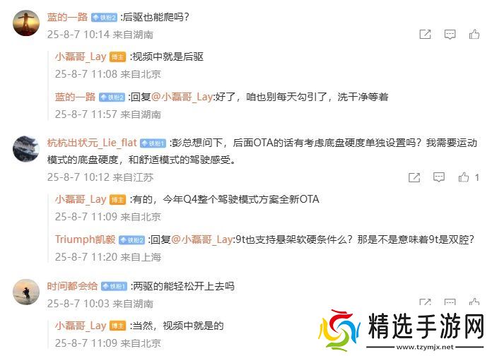 华为智选车产品总监(享界系列)彭磊今日转发了该视频,并与网友展开互动:针对享界 S9T 后驱是否能支撑爬坡,他表示“视频中就是后驱”;针对享界汽车后续 OTA 是否能支持底盘硬度单独设置,他回复称“有的,今年 Q4 整个驾驶模式方案全新 OTA”。这意味着享界 S9 汽车将迎新驾驶模式升级。