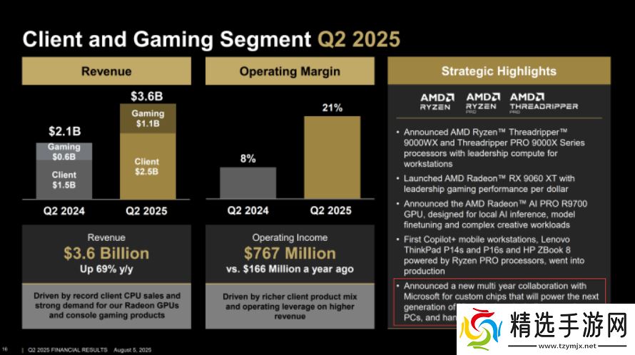本站 8 月 7 日消息,2025 年第二季度,AMD 客户端和游戏部门营收同比增长 69%。该部门包括客户端(Ryzen CPU)和游戏(GPU、SoC)产品。