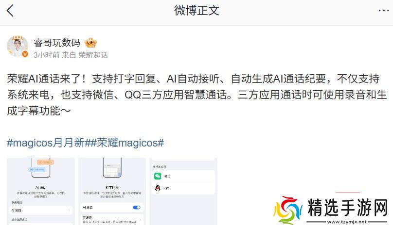 据博主 @睿哥玩数码 分享,荣耀 MagicOS 系统的 AI 语音通话功能支持打字回复、AI 自动接听、自动生成 AI 通话纪要。该功能除支持系统来电外,还支持微信、QQ 三方应用智慧通话。