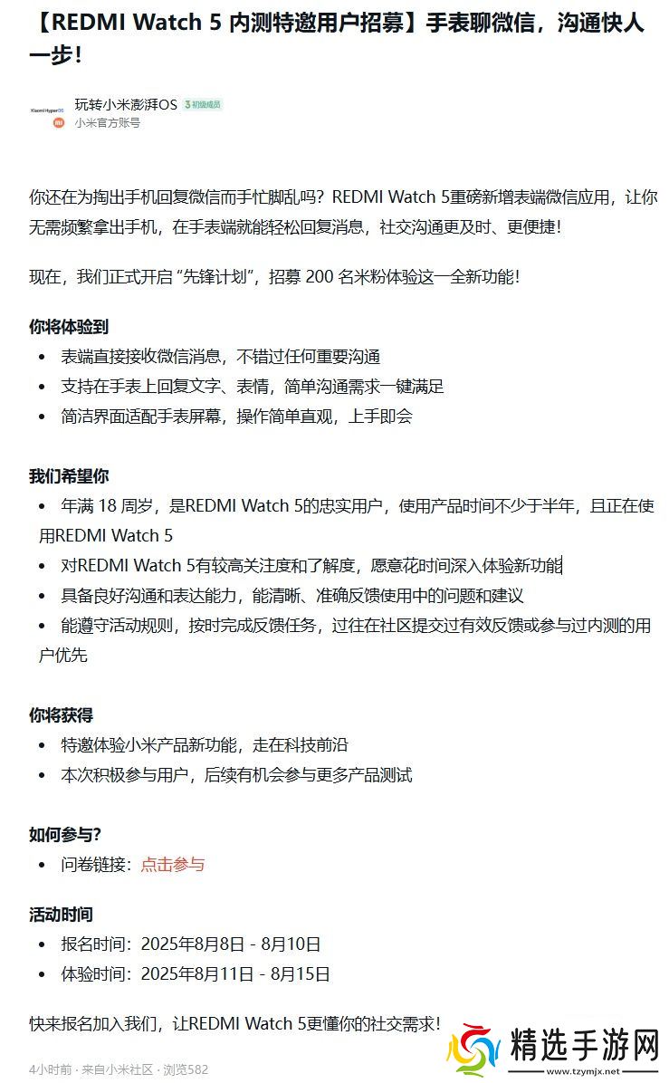 你还在为掏出手机回复微信而手忙脚乱吗?REDMI Watch 5 重磅新增表端微信应用,让你无需频繁拿出手机,在手表端就能轻松回复消息,社交沟通更及时、更便捷!现在,我们正式开启“先锋计划”,招募 200 名米粉体验这一全新功能!你将体验到