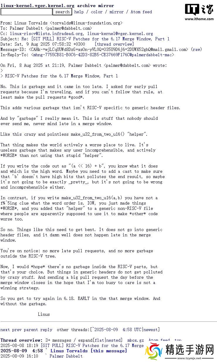 Linus 在邮件列表中表示,Palmer Dabbelt 所提交的代码“质量低劣且严重超时”,并警告“若再提交此类*代码或延迟提交,将不再接受”。