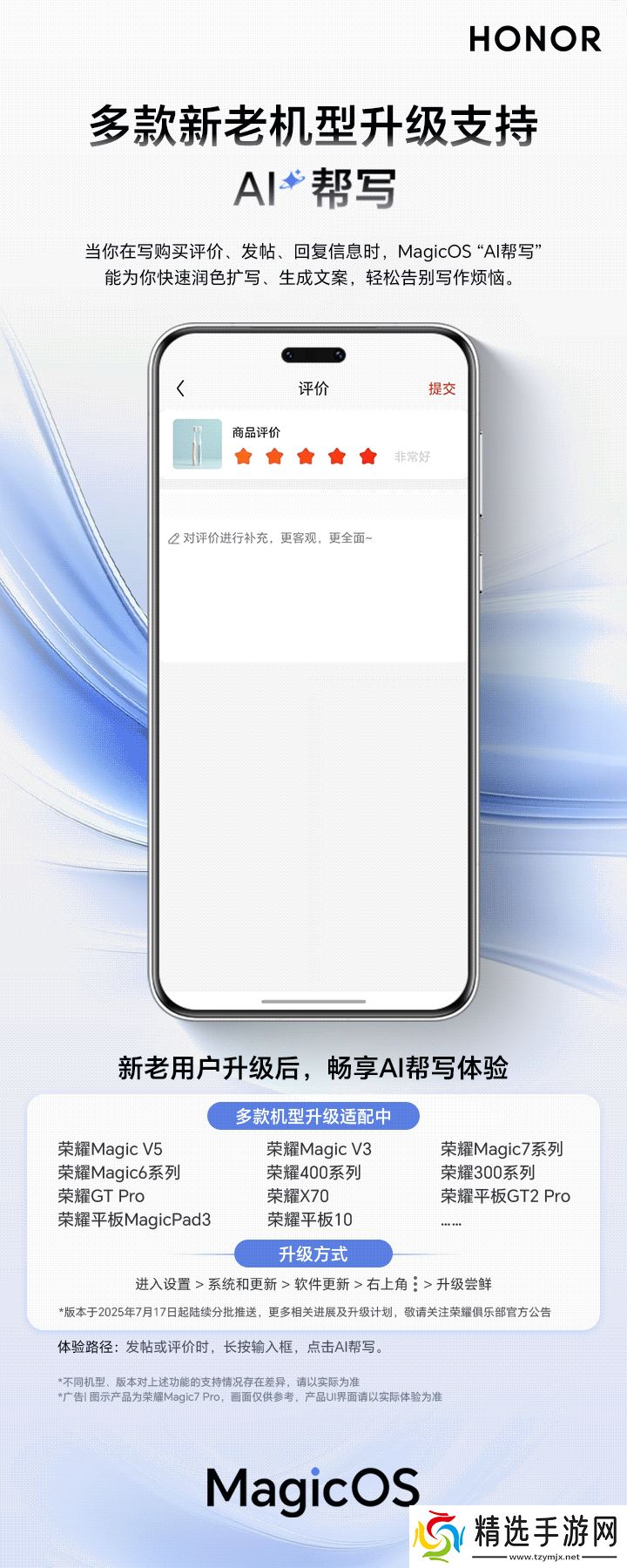 本站 8 月 11 日消息,据荣耀官方产品维护消息,荣耀多款新老机型将升级支持「AI 帮写」功能,含 Magic V3、数字 300 系列等。据介绍,用户在写购买评价、发帖、回复信息时,荣耀 MagicOS 中的 AI 帮写能快速润色改写、生成文案。适配机型如下: