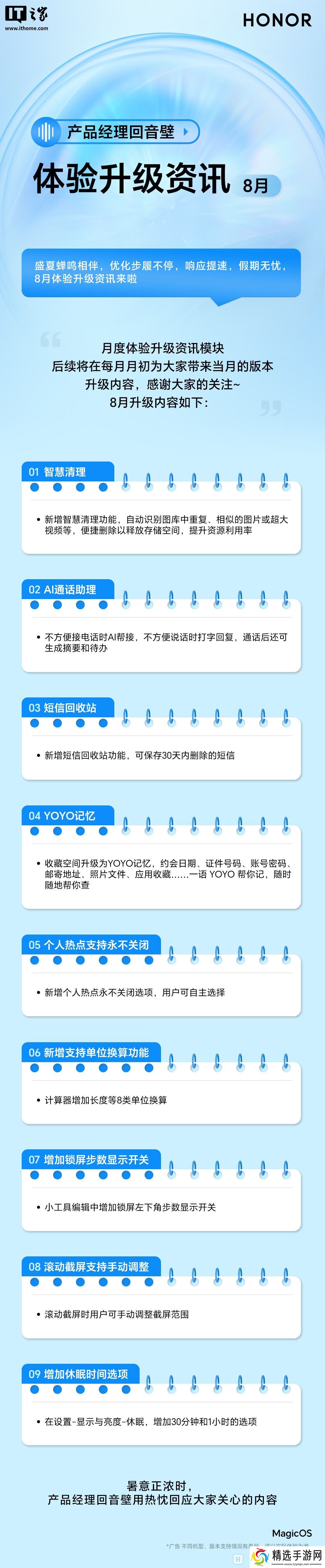 荣耀官方产品维护表示,上述机型为 AI 帮写首批支持机型,更多机型继续适配中。作为参考,荣耀 MagicOS 8 月升级内容如下: