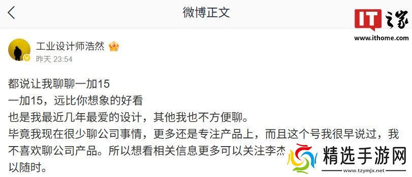 本站 8 月 11 日消息,OPPO 工业设计中心总经理刘浩然今日发文谈及了一加 15 手机。他表示新机远比想象的好看,也是自己最近几年最爱的设计,其他的也不方便聊。
