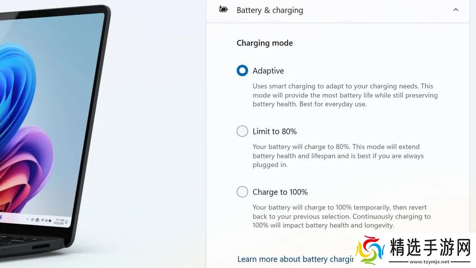 此前,搭载骁龙处理器的 Surface Pro 11 和 Surface Laptop 7 具有一项名为智能充电的功能,该功能会根据设备的充电频率动态启用电池充电限制。然而,用户无法在 Windows 系统内覆盖这一设置,只能通过 UEFI 设置启用或禁用 50% 的充电限制。此次更新后,用户可以在 Surface 应用程序中直接调整电池充电限制,提供了三种选项:自适应、80% 充电和 100% 充电。其中,80% 充电选项是新增的,用户可以选择让设备仅充电至 80% 的容量,以延长电池寿命。