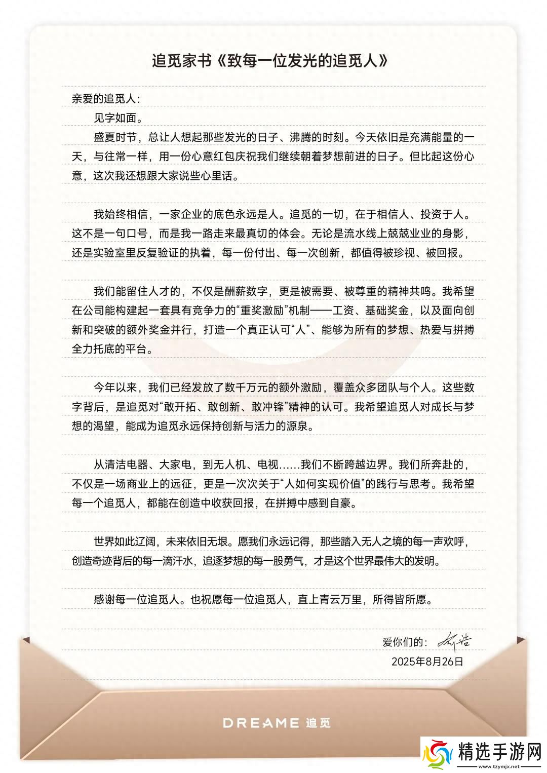 本站 8 月 26 日消息,追觅科技创始人兼 CEO 俞浩今日发布全员信,宣布向全体员工发放超 200 万元全员红包。