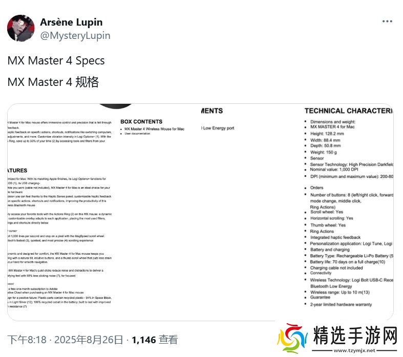 在硬件规格上,新款搭载 Darkfield 高精度传感器,默认 1000 DPI,可在 200-8000 DPI 范围内以 50 DPI 为步进进行调节。整机配备八枚可编程按键,其中包括新增的手势功能键与可点击的操作环。连接方式支持 Logi Bolt 接收器及蓝牙,并可同时连接多台设备,提供 PC、Mac 及商务版选择。