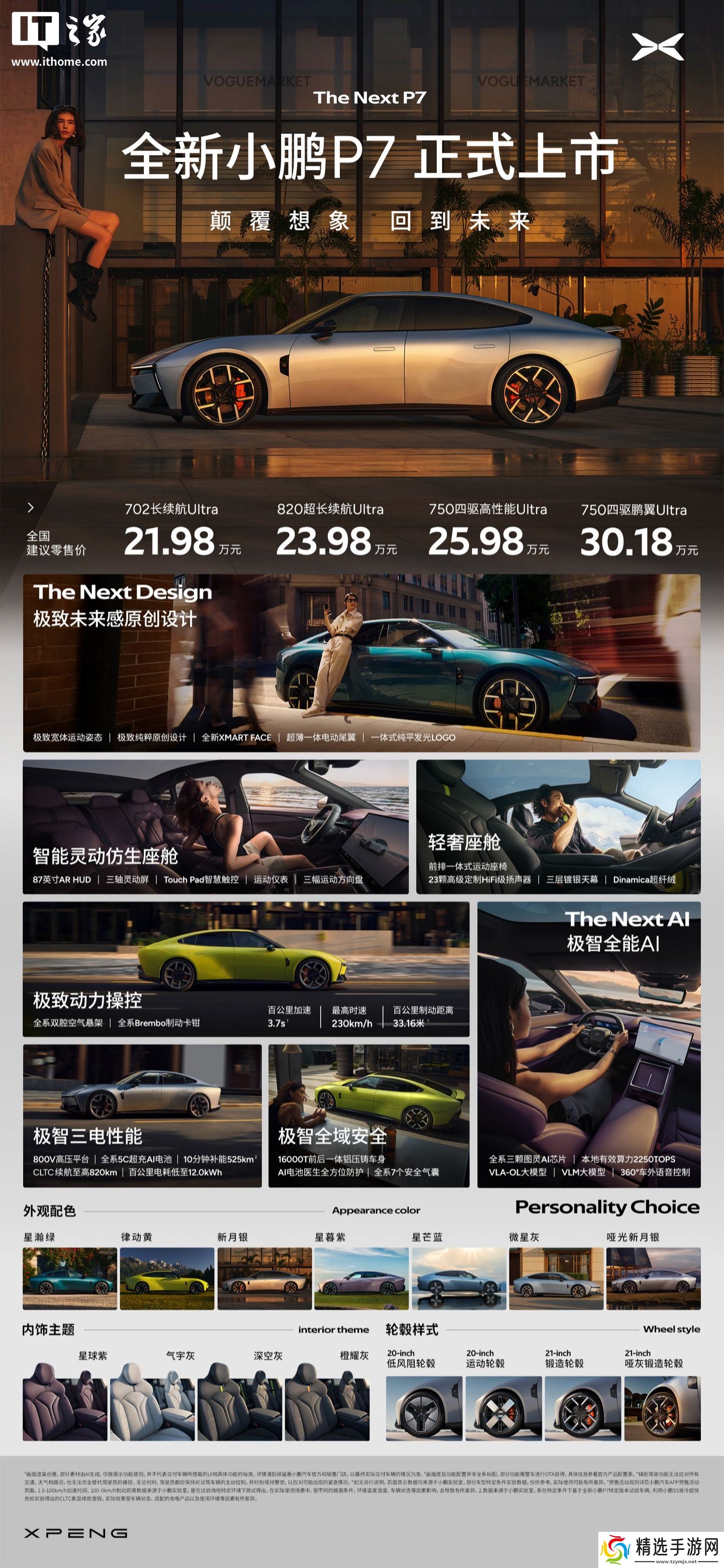 本站 8 月 27 日消息,全新小鹏 P7 汽车已于今晚正式上市,新车全系 800V 架构、标配双腔空悬,提供 820km 超长续航版、750km 高性能版、702km 长续航版三种不同配置,售价 21.98 万-30.18 万元起。